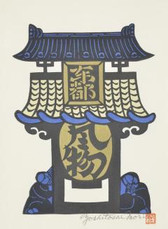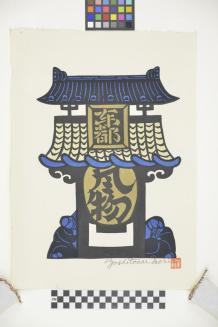 DescriptionDepiction of a pagoda style lantern with Japanese characters.Colour: black; blue; brown; beige;