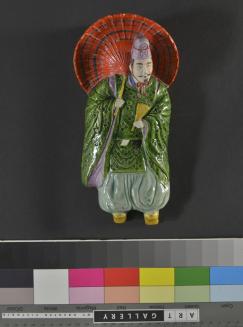 DescriptionVase is in the shape of a man in a green robe and purple hat, carrying a large open orange umbrella over his right proper shoulder. Vase opening is at the top of the umbrella. There is a small circular opening on the flat back surface at the top.Status
