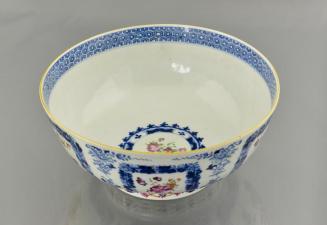 DescriptionExport ware porcelain bowl with rounded sides and a straight foot; decorated in blue & white underglaze designs and overglaze florals in famille rose;Status