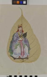 DescriptionChinese export painting; image depicts a seated male figure in robe of purple, green, yellow and white, holding a feather fan in his left hand proper and wearing a red headdress;Status