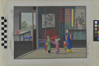 DescriptionChinese export painting; image depicts a domestic scene with a woman and three children; interior of home with furniture etc. in the background;Status