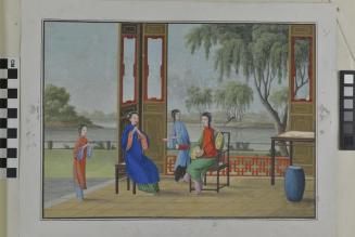 DescriptionChinese export painting; image depicts four women in a courtyard or patio with trees and water in the background. One woman plays a horn, one a long necked stringed instrument and another beats on a small drum with a younger woman holds a dish.Status