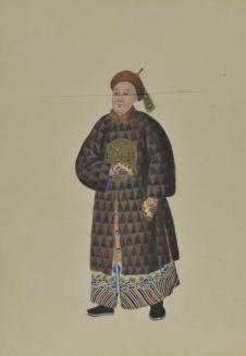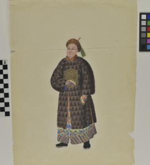 DescriptionChinese export painting; standing portrait of a Chinese man (tartar) wearing a long brown fur coat over a dragon robe;Status