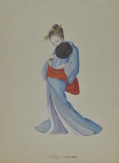 DescriptionChinese export painting; portrait of a woman in a long blue, white and mauve robe with a large red sash. She stands holding a black fan to her lower faceStatus