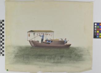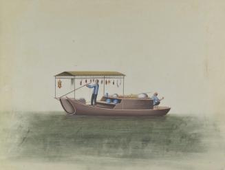 DescriptionChinese export painting; sampan boat with a canopy hung with pieces of meat; two men man the boat;