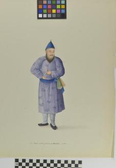 DescriptionChinese export painting; Portrait of a standing man from the province of Ho-nan, wearing a purplish robe, a blue sash and a blue conical hat. He is holding a small bird in his left hand proper;Status