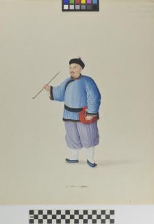 DescriptionChinese export painting; standing portrait of a man wearing a blue jacket, blue pantaloon type pants, and a blue hat, and carrying a long narrow pipe in his right hand proper;Status