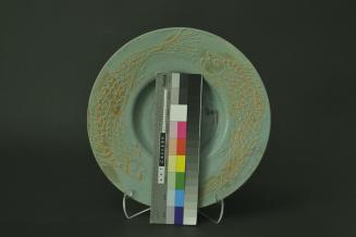 DescriptionLarge circular plate with a steep well and a wide flat rim decorated with slipware fish; overall green glaze with fish details in brownsStatus