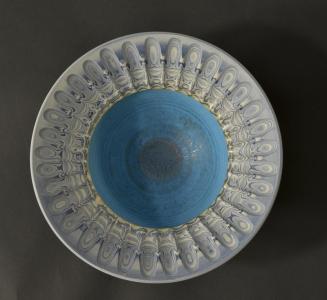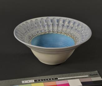 Descriptionagateware bowl has a wide flared and fluted rim (reversed Haida hat shape) with blue and white decorative striations exposed; well is glazed solid turquoise blueStatus