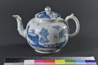 Descriptionlarge lidded hot water pot (Dr. Wall Period), painted overall with decoration in underglaze blue with classic 'chinoiserie' garden designs including pagodas and willow tree; body is rounded; bullet form finial on lid;Status