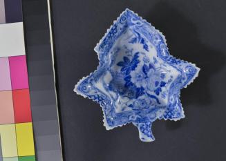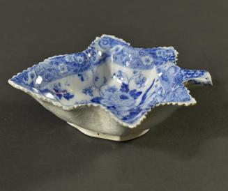 Descriptiondish is leaf shaped with a blue and white floral design with a decorative border in the well and and a raised relief pattern of leaf veins on the exterior; small raised foot;Status