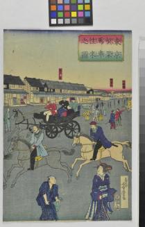 DescriptionBusy city scene with pedestrians, people on horseback, horse pulled cart and buildings in the backgroundStatus