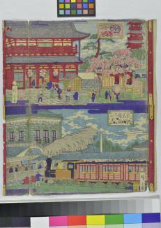 Descriptionprint consists of two images printed on one sheet of paper: a scene with a temple and people in the courtyard, and a scene with a train pulled into a station.Status