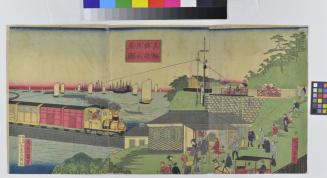 Descriptiontriptych print depicts the city of Tanakawa with sailing vessels, a bridge and buildings with pedestrians, a steam engine, and an electrical power lineStatus