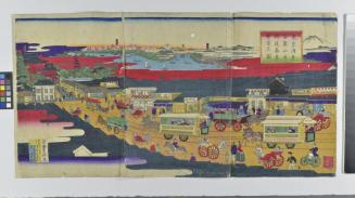 Descriptiontriptych print depicts a scene at Kinryuzan, Asakusa in Tokyo. Numerous horsedrawn trams, transport vehicles, rickshaws and pedestrians travel along a busy streetscape with a harbour and Mt. Fuji in the background.Status