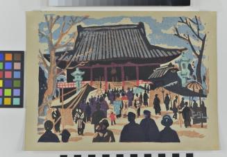 Descriptioncity scene in Tokyo with a large temple in the background and silhouettes of numerous people ascending the stairs of the temple and going about their business in the foreground