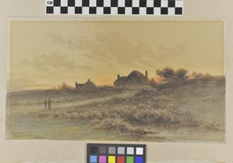Descriptionlandscape scene with two figures on a country road and two buildings (homes?) in the background;