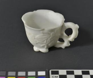 Descriptionsmall white stone cup with a branch-like handle and carved decorative floral motifsStatus
