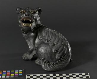 Descriptionblack glazed lion dog is seated with head turned to left proper with mouth open and white teeth bared; stylized furStatus