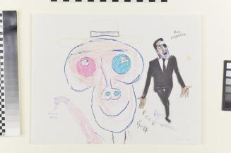 Descriptionfreehand sketch of a face in the foreground, male figure in the background wearing a black suit with an eyepatch and mouth open.Status