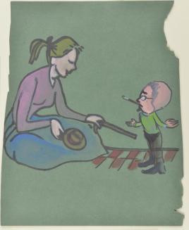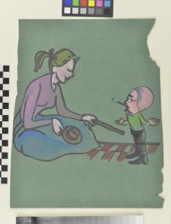 Descriptiondrawing of a seated young woman, holding a cane in her left hand and a hat in her right, addressing a small male figure with a cigarette in his mouth.Status