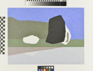 DescriptionLandscape with white rock, & large black rockColour: black; blue; olive green; green; grey brown; dark grey; pale blue; paler blue
