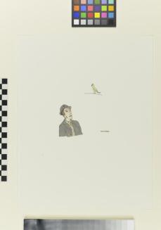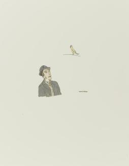Descriptionfreehand sketch of a man in a bowler hat staring up at a yellow bird perched on a wireStatus