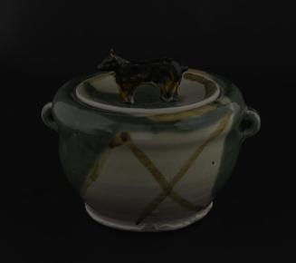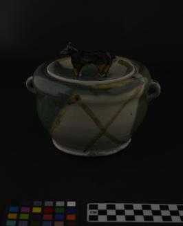 DescriptionLidded pot; green and white slip; two small potruding handles; concave lid with ceramic bear figure as handle; 'oribe technique';