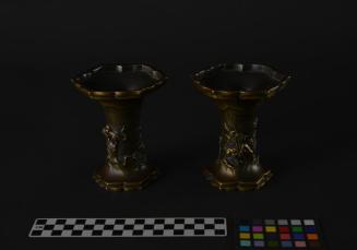 Descriptionpair of bronze altar vessels; stem pictures bamboo and tigers; base and top in floral shape (6 petals)Status