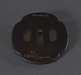 Descriptionone Tsuba (swordguard); design is of tanuki turning into a tea-kettle; central hole for the insertion of the swordblade; shaped as a mokko (four-leaf clover);Status