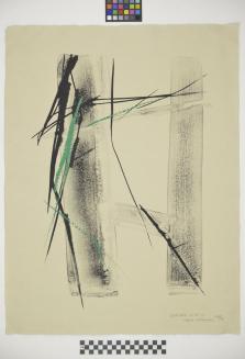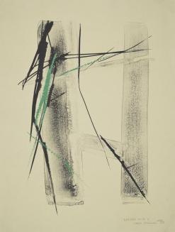 DescriptionAbstract; "H" shape with black and green lines; cream coloured support;Status