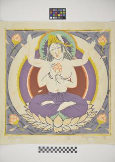 Descriptionseated female figure with four arms, holding a flower; circular pattern in the background;