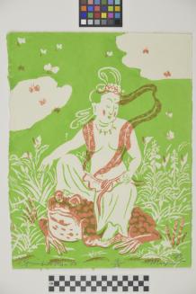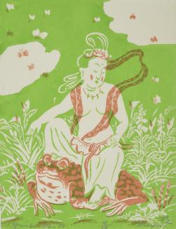 DescriptionImage depicting a goddess seated on a toad. Green background with foliage, butterflies/ insects in the sky.