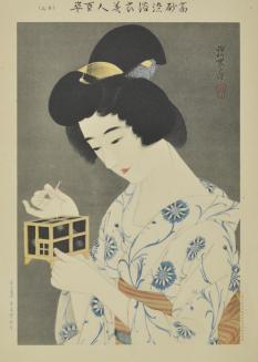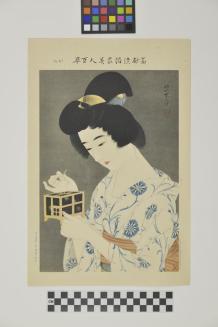 Descriptionfemale figure in a blue floral robe holding a rectangular box in her hands;Status