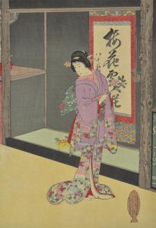 DescriptionA beauty is carrying a twig of camellia to arrange it in a small vase attached to a pillar. A large calligraphy scroll is hanged in the alcove of a large living room. The utensils of flower arranging are left on the tatami mat in the alcove.Status