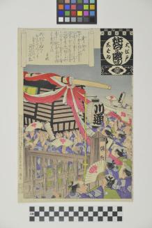 Description"Oh Edo nenju Gyoji Shibai" (Annual Events of the Theatrical Year in Great Edo). A set of 25 designs, 23 by Ginko and 2 by Torii Kiyosada. "Norikomi" (Arriving). The excited Onoe kikugoro fan club members, Hiiki renchu", are cheerfully welcoming their idol as he arrives by palanquin in the theatre district. The actor's crest, "mon", is emblazoned on folding fans people are waving.