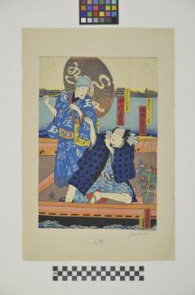 Descriptionkabuki actoris, Nakamura Ebizo ? (Left) and Bando Hikosaburo are in the roles of two passengers on a ferry boart.