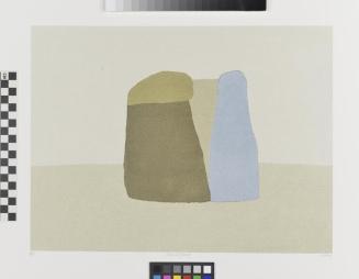 DescriptionLandscape with three vertical objects, one blueColour: blue; umber; raw sienna; buff; pale buff