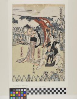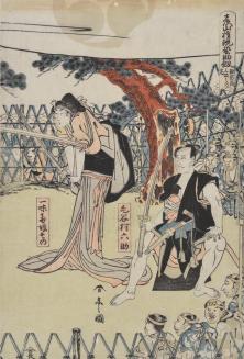 DescriptionA scene from a popular revenge story, "Hikosan Gongen Chikai no Sukedachi". Ichimisai was the sword instructor for the army of the lord of Choshu province. He was tricked and killed by Kyogoku Takumi. Here Sono, the daughter of Ichimisai, is avenging her father's death with the help by her husband, Rokusuke of Ketani village.Status