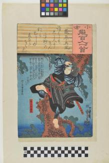 Description"Ogura Nazorae Hyakunin Isshu" (Ogura Imitation of One Hundred Poems by One Hundred Poets) No. 34. Poem by Fujiwara no Okikaze, "Who is still alive when I have grown so old that I can call my friends? Even Takasago's pines are not friends of former days". In the lower cartouche, Higuchi kanemitsu keeps a vigilance at a tree top of an old pine tree.Status