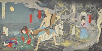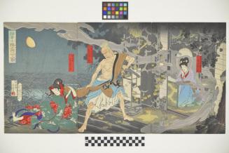 DescriptionA girl Asaji (played by Onoe Einosuke) was about to be killed by the demon Ibaraki (Onoe Kikugoro). Kannon Bodhisattva in disguise (Iwai Matsunosuke) came to rescue the girl. All of which happened in a lonely house in Adachi-ga-hara moor.
