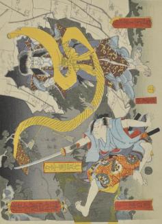 DescriptionTwo uncut book cover illustrations for "Wabunko" vol. 41 Part 1 and Part 2. Story by Mantei Ouga. Evil magician is reading the magic scroll to deflect the shower of arrows and a samurai trying to attack him.Status