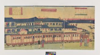 DescriptionView of a steam locomotive train passing through the city. Steam rises from the engine's smokestack, and the cars are crowded with passengers. A few groups of men stand chatting beside the rails, including a Chinese man with a long pigtail at BRC. Two- and three-story buildings overlook the train, with beauties and guests watching from the verandah. The masts of ships anchored in the harbor can be seen on the horizon.Status