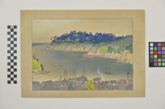 DescriptionView of Manazuru Bay in Izu Province. The foreground is crowded with the rooftops of the city, a single plume of white smoke rising from a chimney, with boats anchored in the harbor just beyond.Status