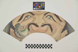 DescriptionHumorous image of Daikou, the god of fortune. His gold coin producing mallet is in front of him. A large fan shaped print.Status
