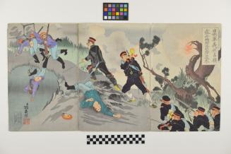DescriptionBattle scene from Russo Japanese War, Japanese charging in from BR, central figure blowing horn, two fallen solders in the foreground, smoke and explosions in the background,Status