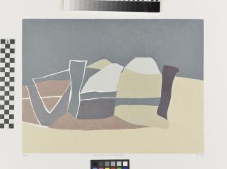 Description2Landscape with green sky, beige groundColour: black; dark grey; dark grey green; pale grey; dark grey; brown; ochre; grey ochre