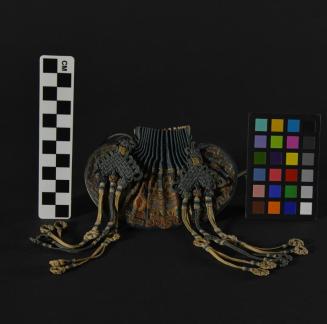 DescriptionSmall green silk purse with cream side reverse; gold thread details; two long green string handles, and hanging tassels;Status