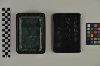 DescriptionRectangular inkstone mounted within wooded box with lid. Lid displays untranslated inscription.Status