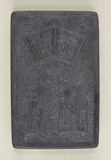 DescriptionRectangular, soft black ink stone, with wooden box (base and lid).Status